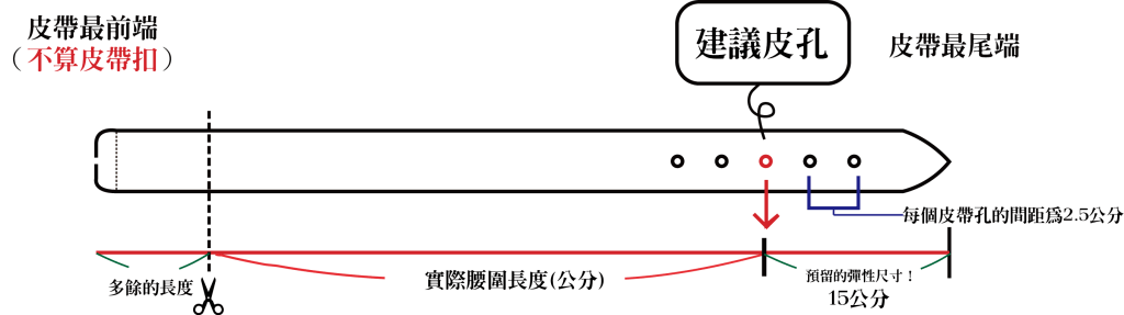 計算範例: 小明實際腰圍85公分,所需皮帶總長為:85+15=100公分。
